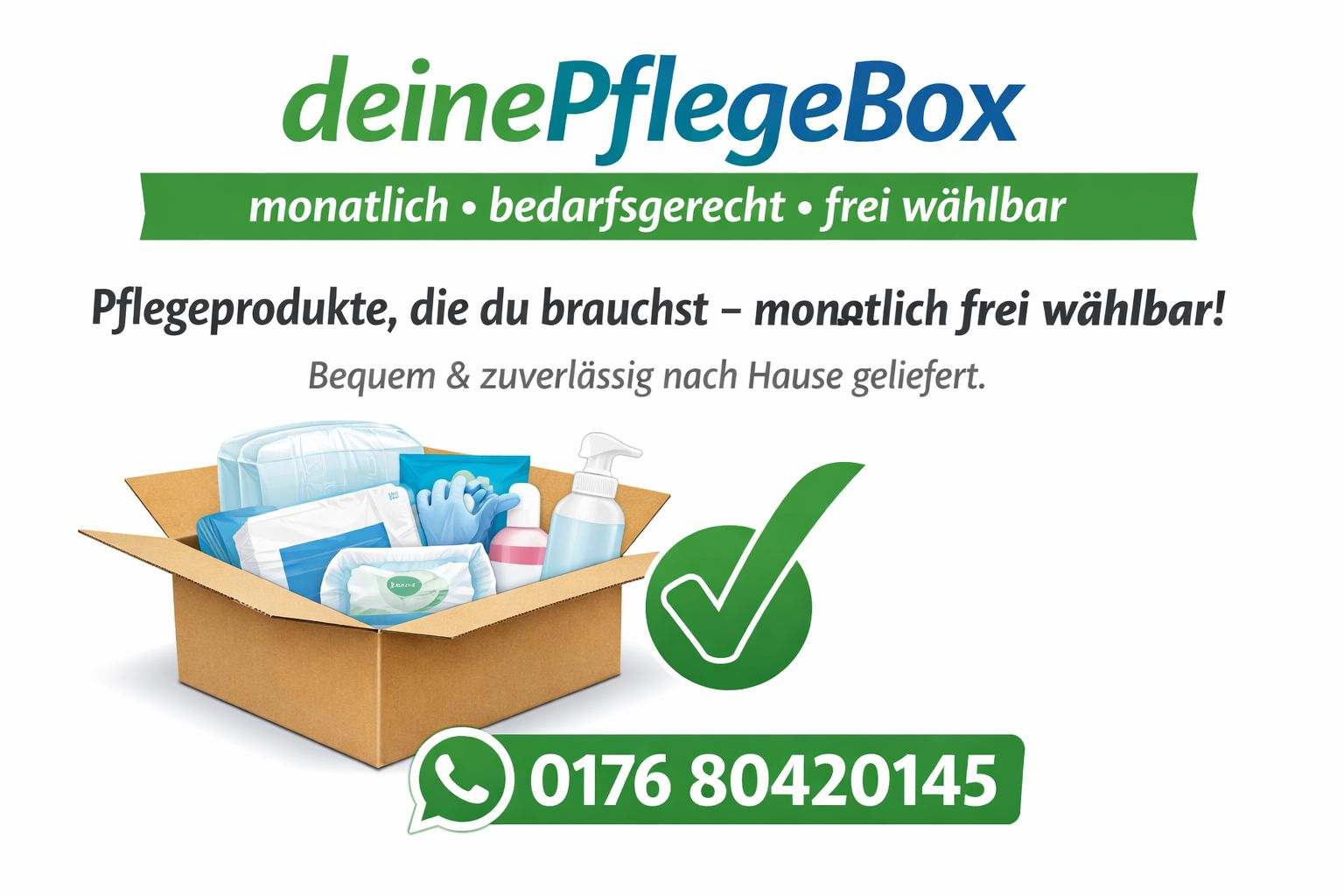Zu den typischen Pflegehilfsmitteln gehören Einmalhandschuhe, Flächen- und Händedesinfektion, Bettschutzeinlagen, Schutzschürzen oder Mundschutz. Unser Partner Deine Pflegebox NRW kümmert sich um alles – von der Antragstellung über die regelmäßige Lieferung bis hin zur Direktabrechnung mit der Pflegekasse. Für Sie bleibt es einfach und sorgenfrei.